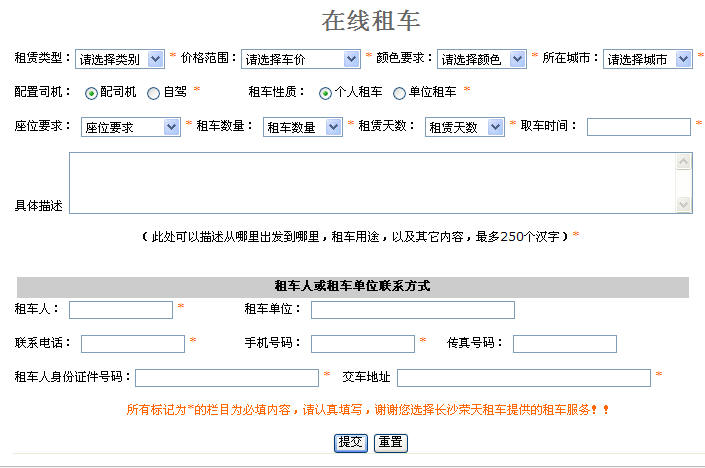 3、選擇或認真填寫帶"*"的欄目,尤其是租車人或租車單位的詳細信息。認真填寫上述必填信息將有助于我們及時和您取得聯(lián)系。